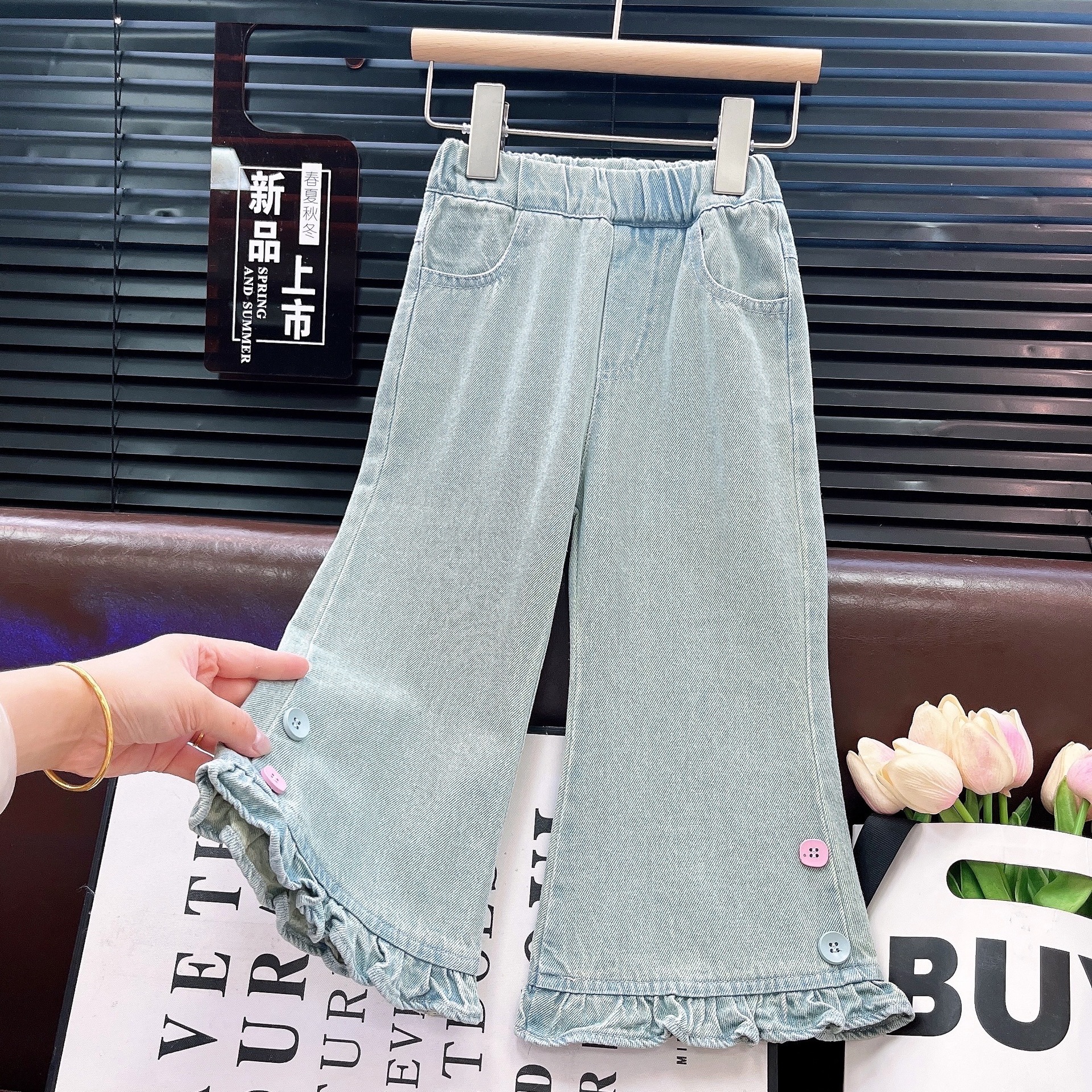 👖 Pantaloni Evazați și Comozi: Pantalonii din denim sunt ușori și lejeri. Croiala largă îi oferă libertate totală de mișcare. Volănașele de la bază sunt un detaliu extrem de drăgălaș. Nasturii decorativi laterali completează perfect designul.