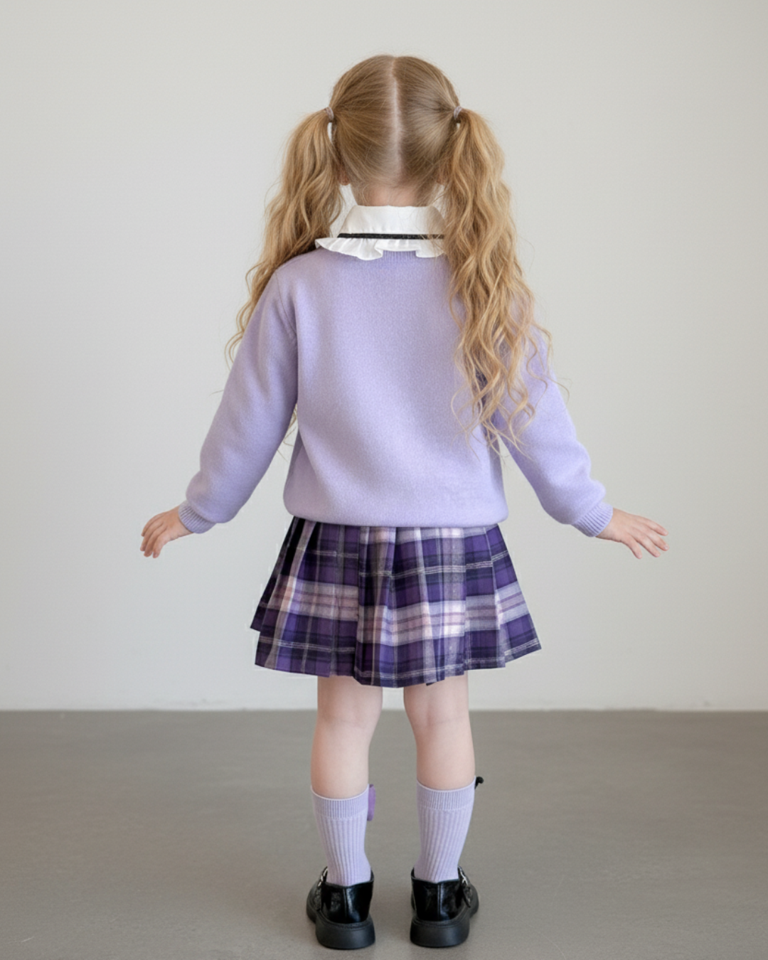 - Fustă în Carouri: Imprimeu tartan modern în nuanțe de mov, ușor de asortat.